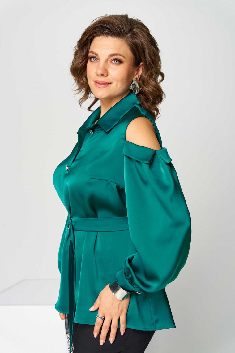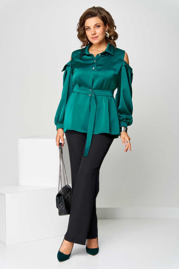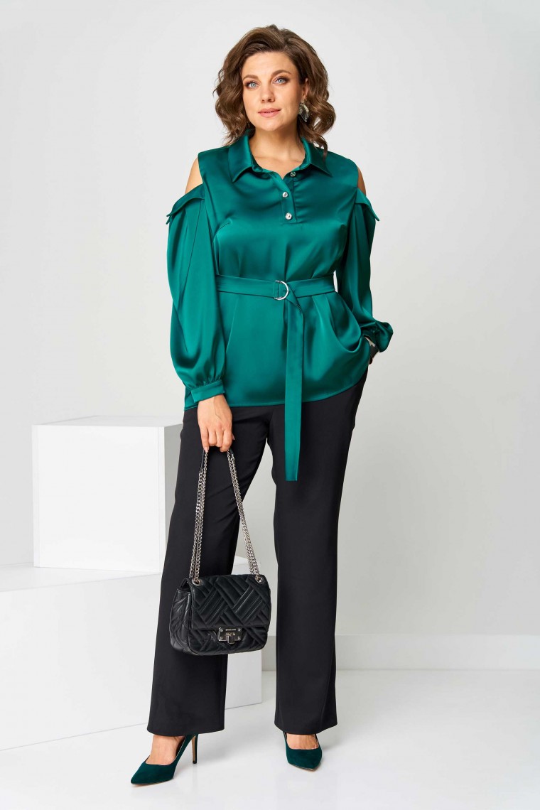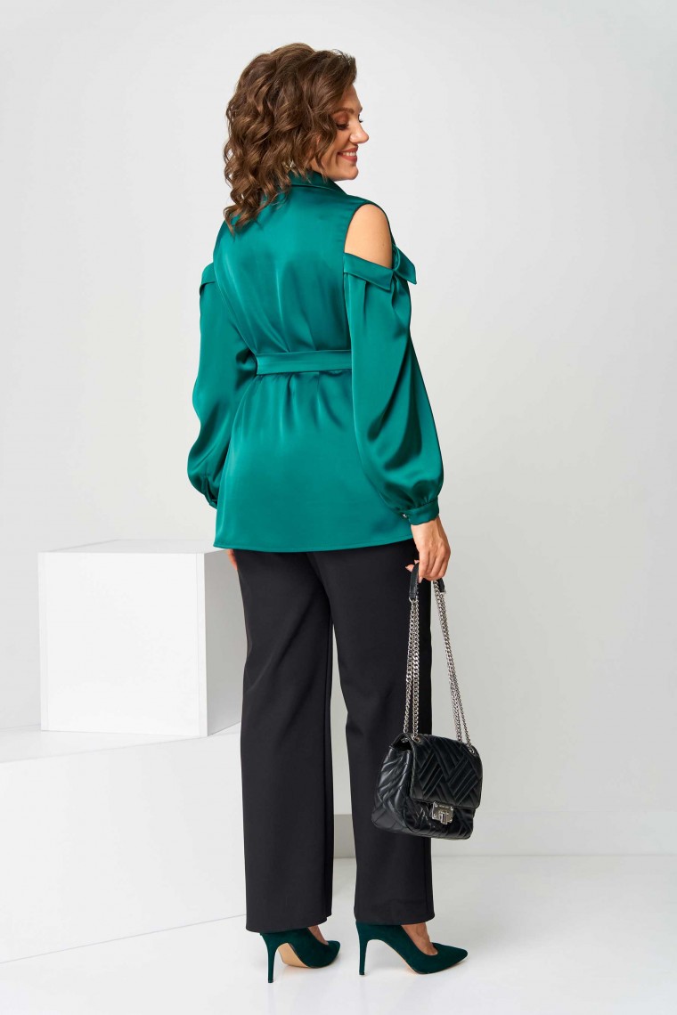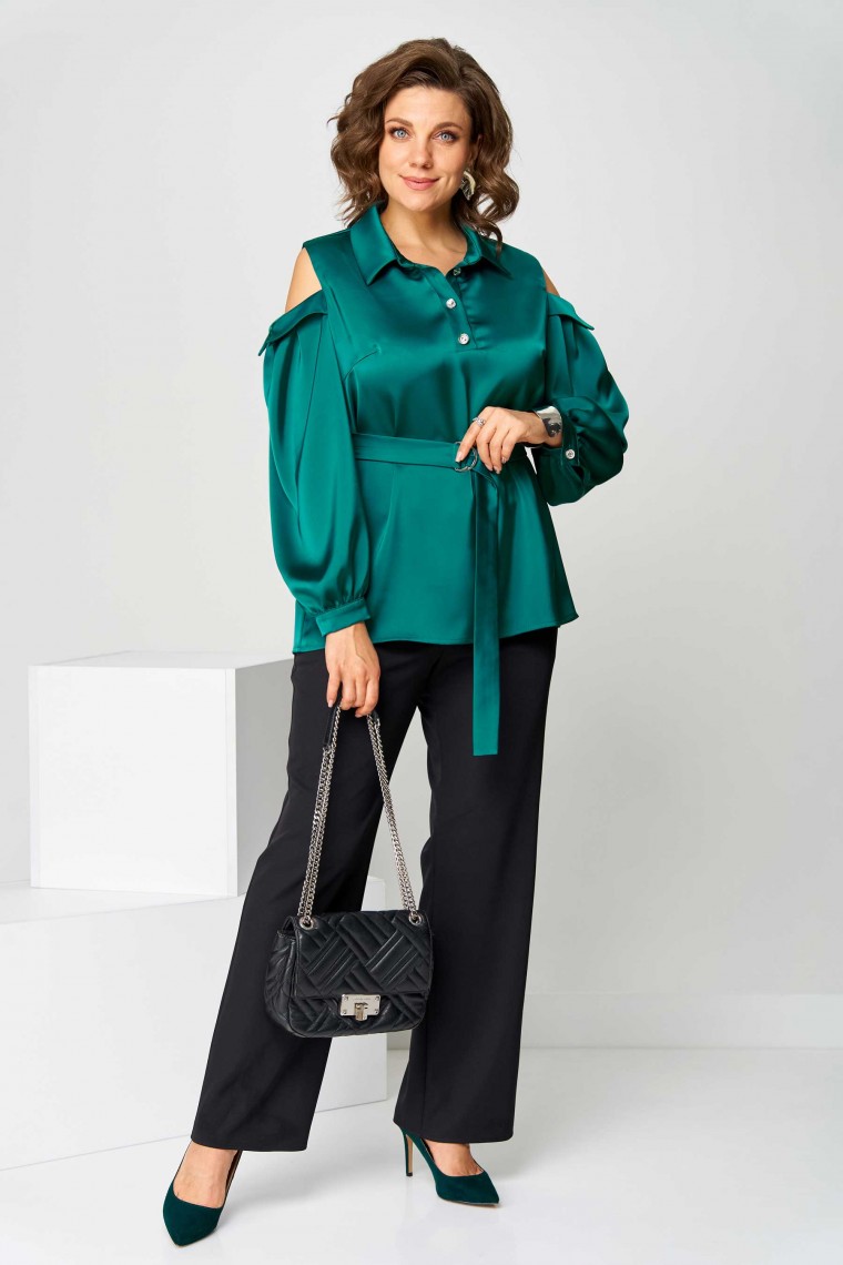 Костюм женский, повседневный, выполнен из блузочной ткани и брючного стрейча. Блузка с воротником мужского типа, по переду центральная планка до середины груди. Рукава длинные на полпроймы, вверху отделочные детали, на манжете. По переду нагрудные вытачки, спинка свободная. Блузка под пояс. Брюки классические, на поясе с резинкой. Вверху косые карманы. Застежка на "молнию" на гульфик.