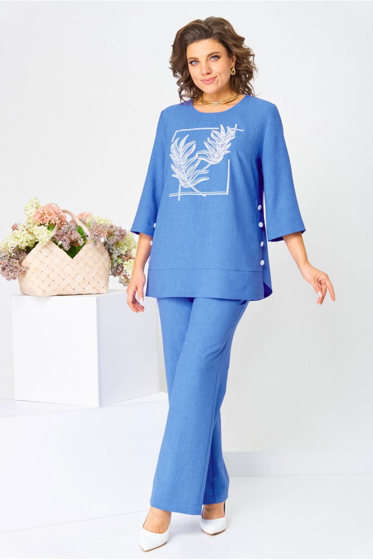 Костюм женский свободного силуэта, состоит из блузки и брюк. Костюм выполнен из стрейчевой костюмной ткани. Блузка с рукавом 3/4, горловина округлая. Перед с нагрудными вытачками, спинка с кокеткой и складкой из под нее. Низ блузки фигурный, по переду манжет. В боковых швах шлицы с пуговицами. В области груди печать. Брюки расширенные, с карманами, на поясе с резинкой.