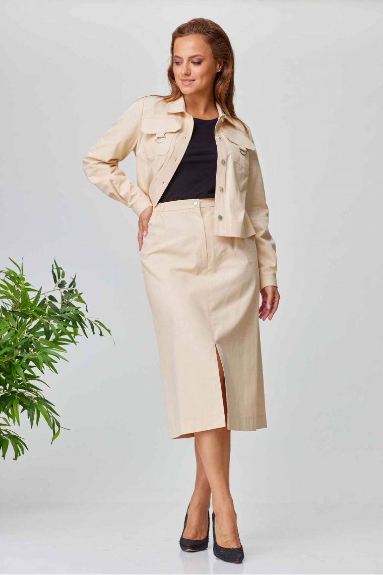 Костюм женский молодёжный свободного силуэта из тонкой джинсовой ткани. Жакет с длинным рукавом на манжете на пуговицу. Перед с центральной застёжкой на пуговицы. Вверху кокетка с карманами и клапанами с патой на полукольцо. По спинке плечевые вытачки. Внизу декоративная нашивка с логотипом. Юбка на поясе с резинкой. По переду застёжка на гульфик, на тесьму-молнию в среднем шве. По низу разрез. Заднее полотнище с вытачками. В в среднем шве по низу шлица.