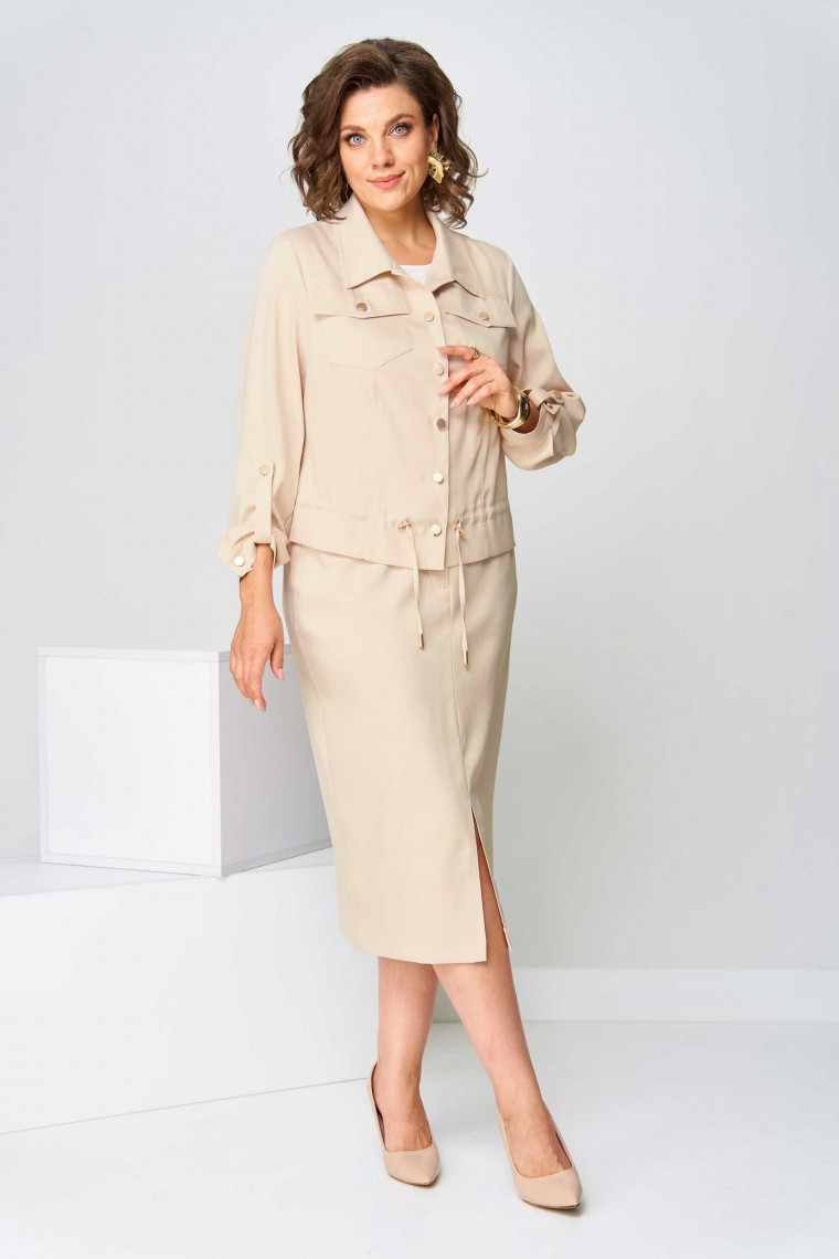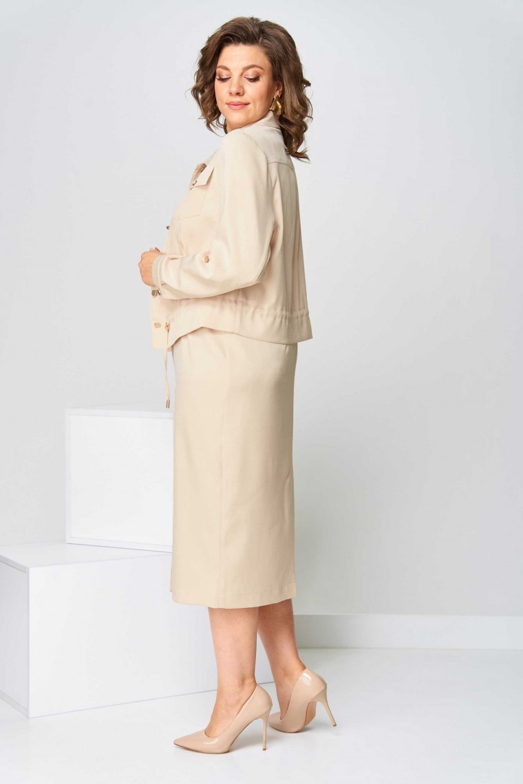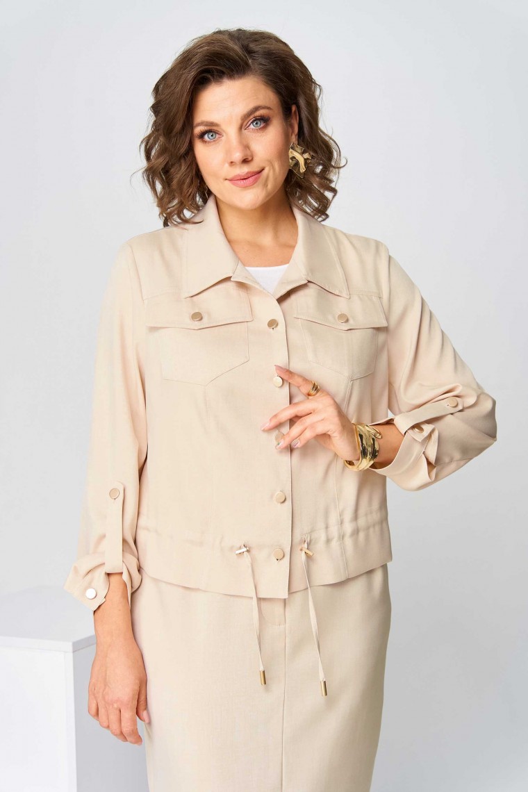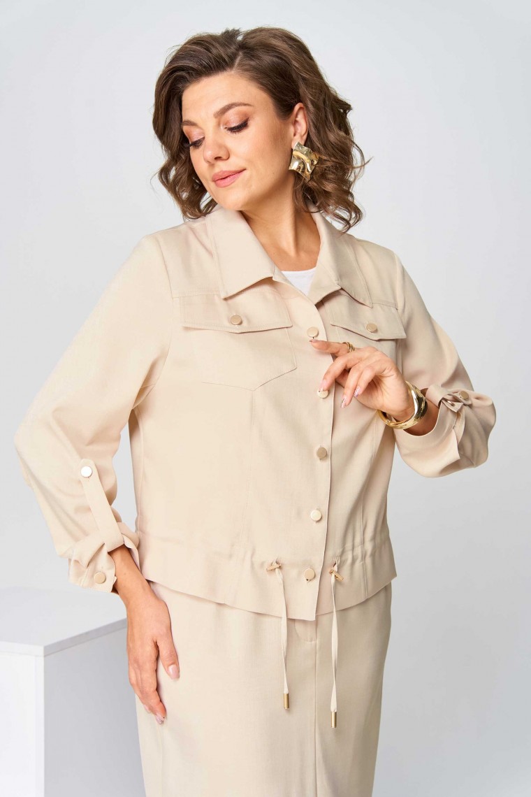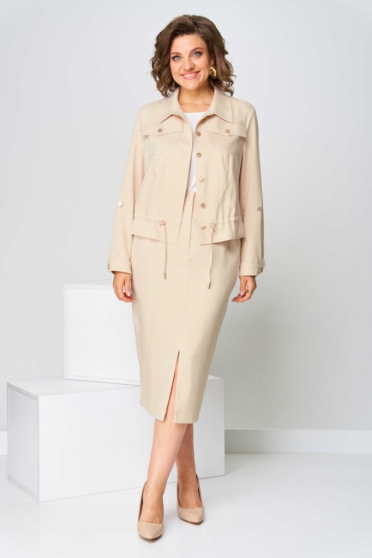 Костюм женский двойка, свободного силуэта, состоящий из жакета и юбки. Жакет с центральной застежкой по переду. Воротник мужской, рукав длинный с манжетом, на пату. По переду и спинке кокетки. Карманы по полочке в области груди. Из-под кокетки рельефы. По низу жакета кулиска.