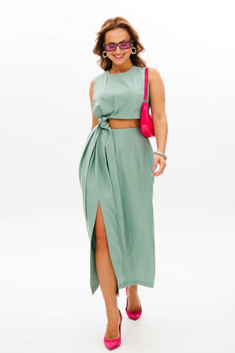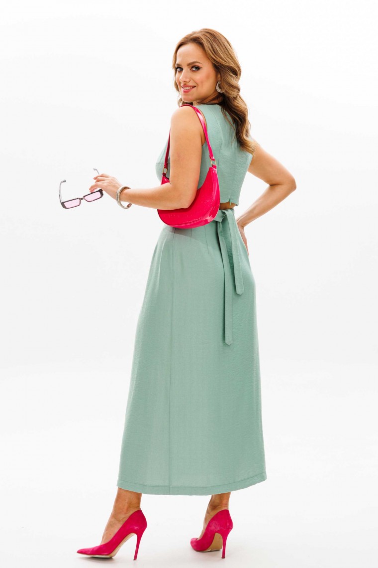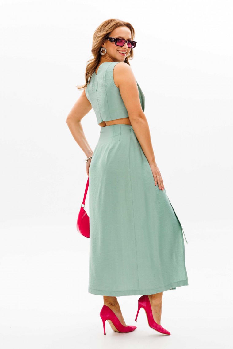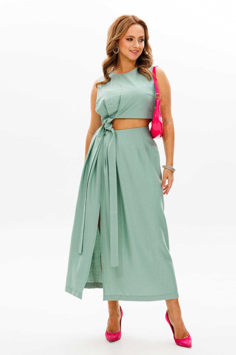 Костюм женский молодежный полуприлегающего силуэта из плательной ткани. Блузка укороченная без рукавов с драпировкой по переду. Спинка с молнией. По переду пришит пояс в области драпировки. Юбка длинная с драпировкой по переду и вытачками. В области складок притачен пояс на завязку с поясом от блузки. Застежка на молнию в боковом шве.